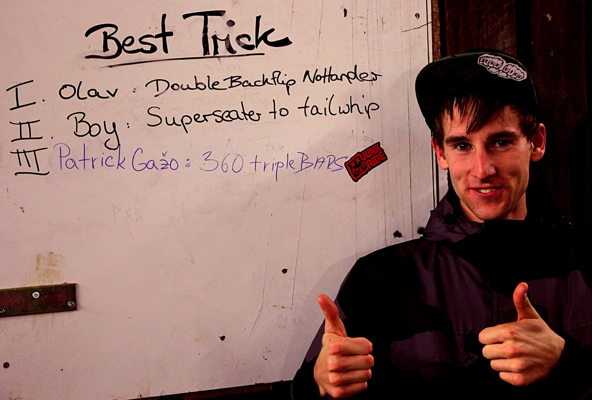Po obede sme sa vybrali do Brannenburgu do haly s foampitom a resi dirtom kde sme boli v prvý deň. Tu sem si dali krutý ride. Najviac zabíjal ako inak Aďo Bujalko a Patrik Gažo, ktorý drtili triky do molitanu a na resi. Patrick  chytil a “ustál” 360 triple barspin ! Aďo drtil backflip kombinácie 720ky a podobne. Skúsili sme si nejaké tie barellroly a podobne.
