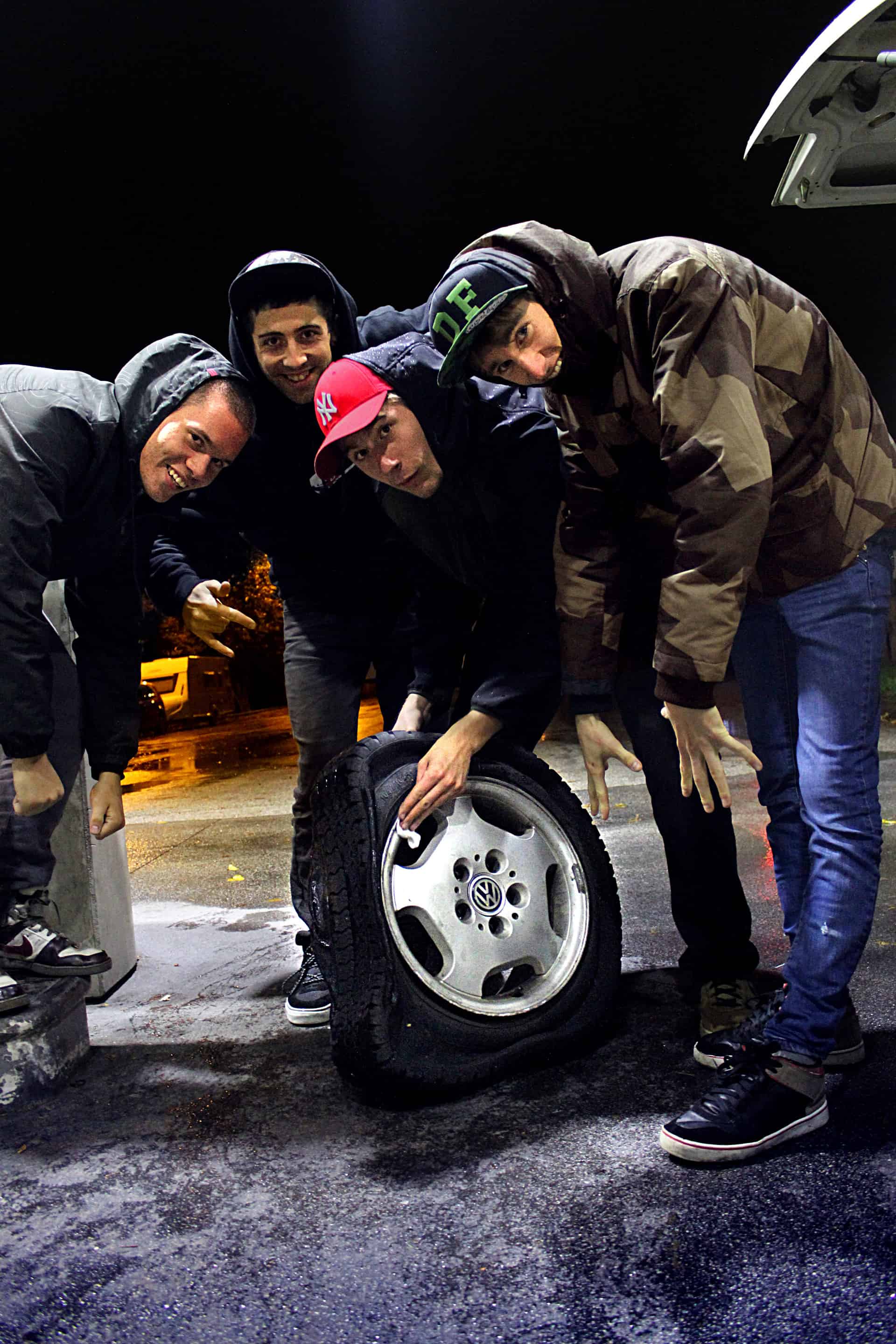 V hale sme pojazdili skvele a o 22:00 sme sa vydali naspäť do Bad Aiblingu, keď začalo snežiť. Celá oblasť bola totiž celkom hornatá a zatiaľ čo na Slovensku ste mali fajnových 20 stupňov my sme sa triasli v zimných bundách. Tak sme si išli v snehovej výchrici po diaľnici, viditeľnosť nulová a do toho sme dostali defekt ! Hneď sme to parkli na benzinku. Jednoduchá výmena a ideme ďalej ? Bolo by tak keby Adrošov mechanik pre lepšiu bezpečnosť nadal na skrutky v kolese špeciálny sprej, vďaka ktorému sme nevedeli povoliť skrutky a museli sme zháňať väčší kľúč :D