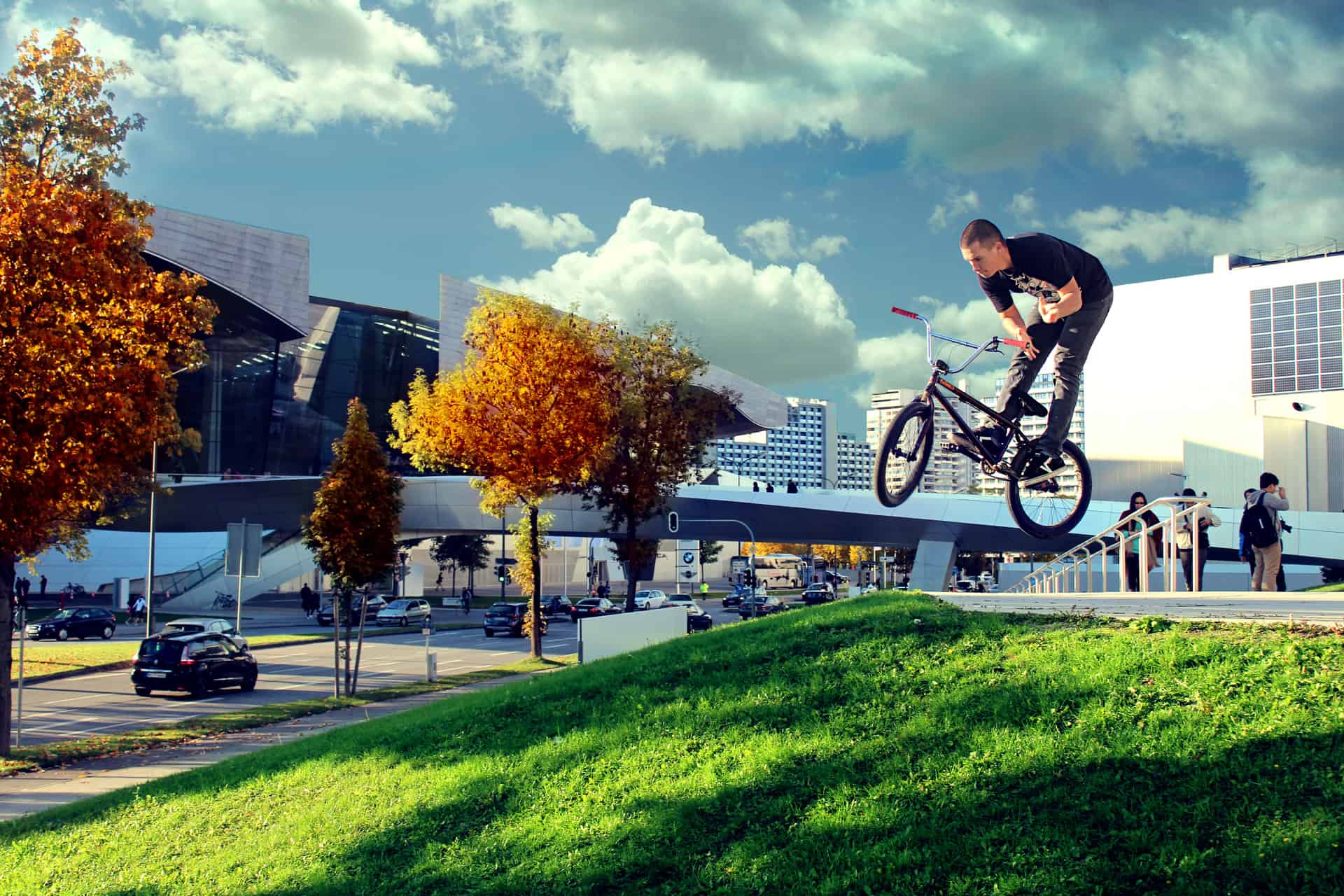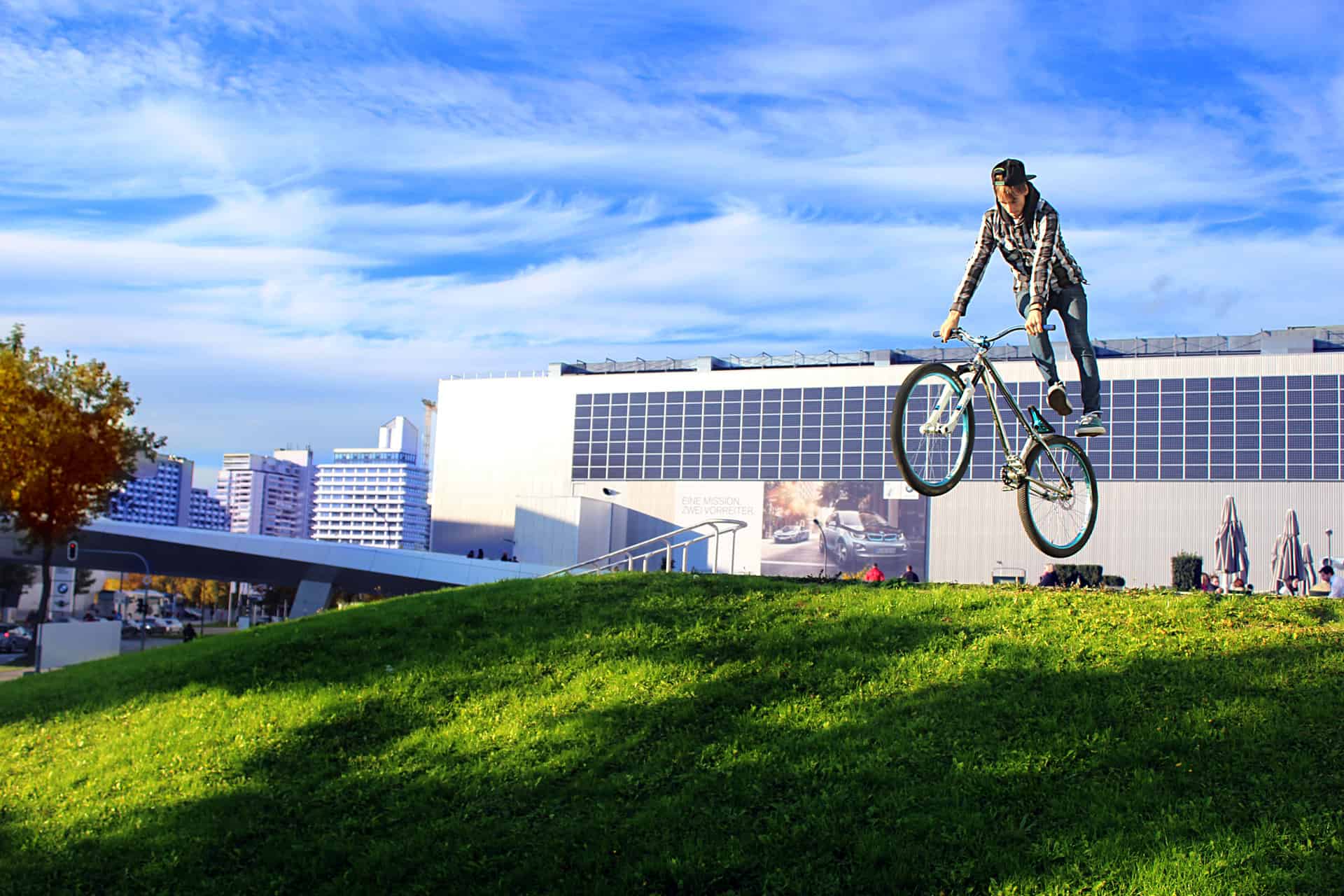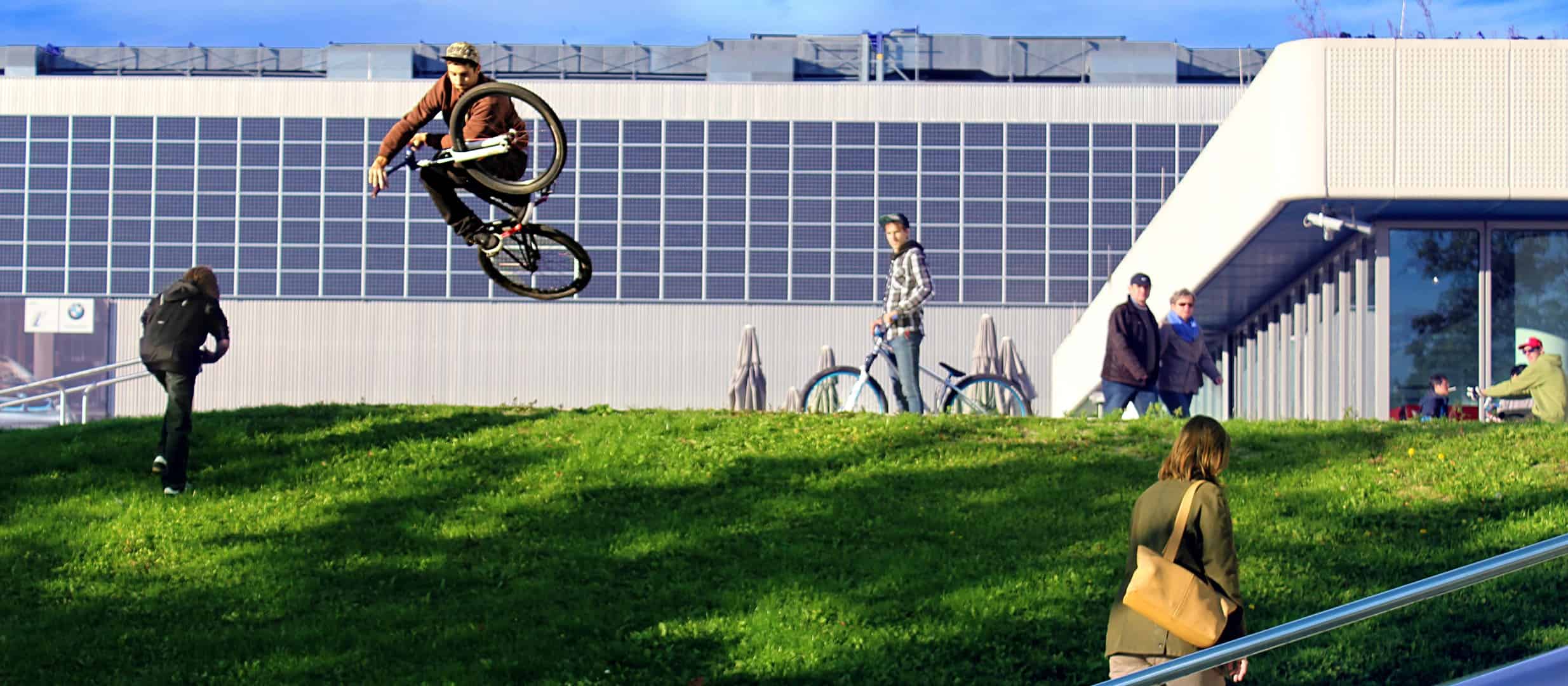 V nedeľu sme sa vybrali do ulíc Mníchova. Bol to prvý teplejší slnečný deň tripu, takže sme boli dosť radi. Užívali sme si jazdu mestom a sledovali futuristické budovy, ulice a vlastne všetko. Na niektorých miestach sme si vážne pripadali ako v blízkej budúcnosti. Na začiatku sme objavili jeden street spot zašitý vedľa parku celý obkolesený živým plotom a vznikli takéto fotky:
