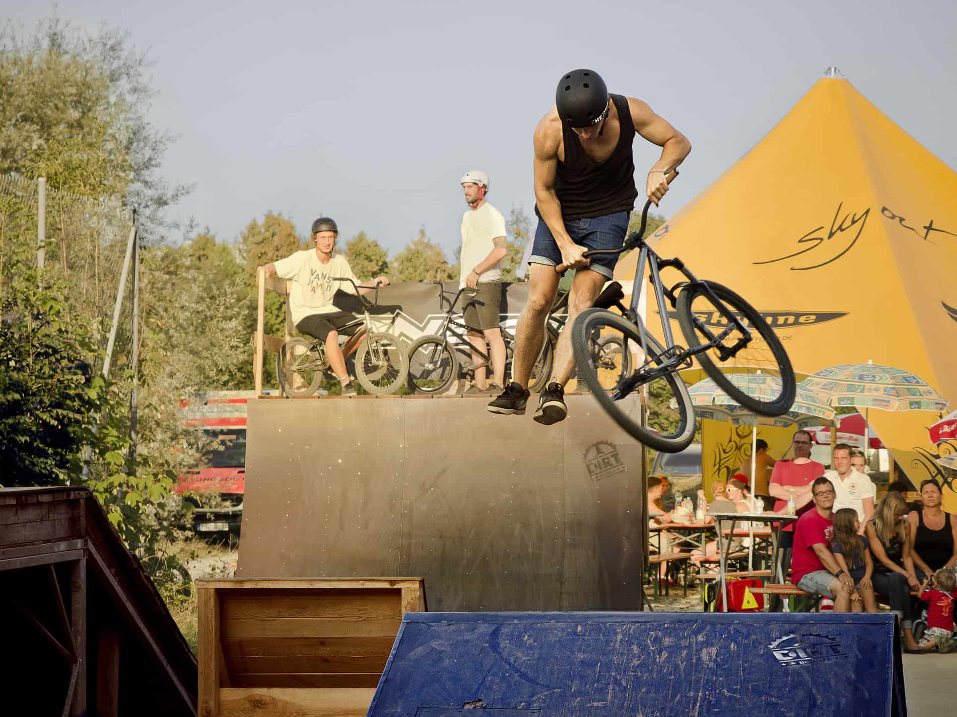 Ale naspať k jamu. Best trick na dirtoch vyhral nemenovaný BMX jazdec s menom na tri riadky so svojim double-tailwhipom cez prvý asi 6 metrový dirt… 2. Miesto si zaslúžil chalan na mtbéčku s pretiahnutým supermanom taktiež cez prvý dirt. 3tie miesto bolo udelené za štýlový pendulum (nfcc do oboch strán). Zaujímavé, že nejaké kategórie MTB, BMX vôbec neriešili.